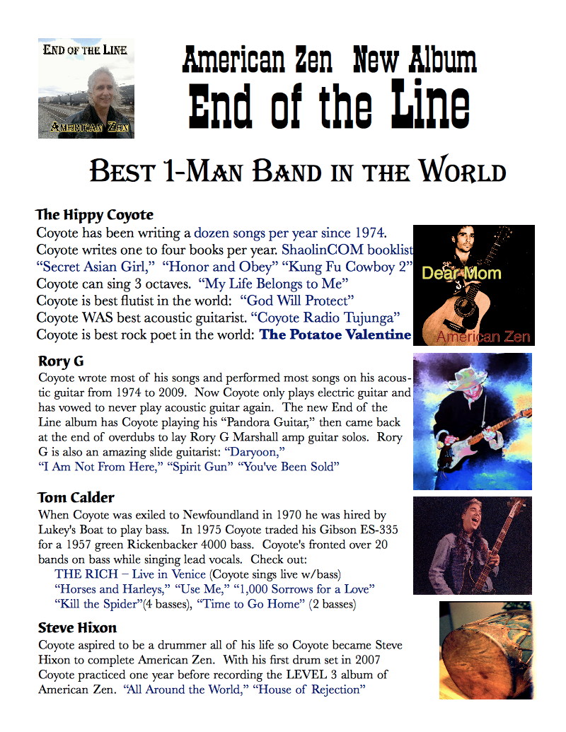 ALBUM EPK - End of the Line by American Zen Music List at shaolinCOM.com Book List of shaolinCOM.com song sample Secret Asian Girl song sample HONOR and OBEY, CHERISH and PROTECT by American Zen song sample KUNG FU COWBOY 2 song sample MY LIFE BELONGS TO ME by American Zen song sample GOD WILL PROTECT Coyote Radio Tujunga solo acoustic album by Coyote The Potatoe Valentine epic poem by The Hippy Coyote song sample DARYOON by American Zen song sample I AM NOT FROM HERE by American Zen song sample SPIRIT GUN by American Zen song sample YOU'VE BEEN SOLD The Rich - Live in Venice album song sample HORSES AND HARLEYS song sample USE ME by American Zen song sample 1,000 SORROWS FOR A LOVE by American Zen song sample KILL THE SPIDER free song TIME TO GO HOME song sample ALL AROUND THE WORLD song sample HOUSE OF REJECTION