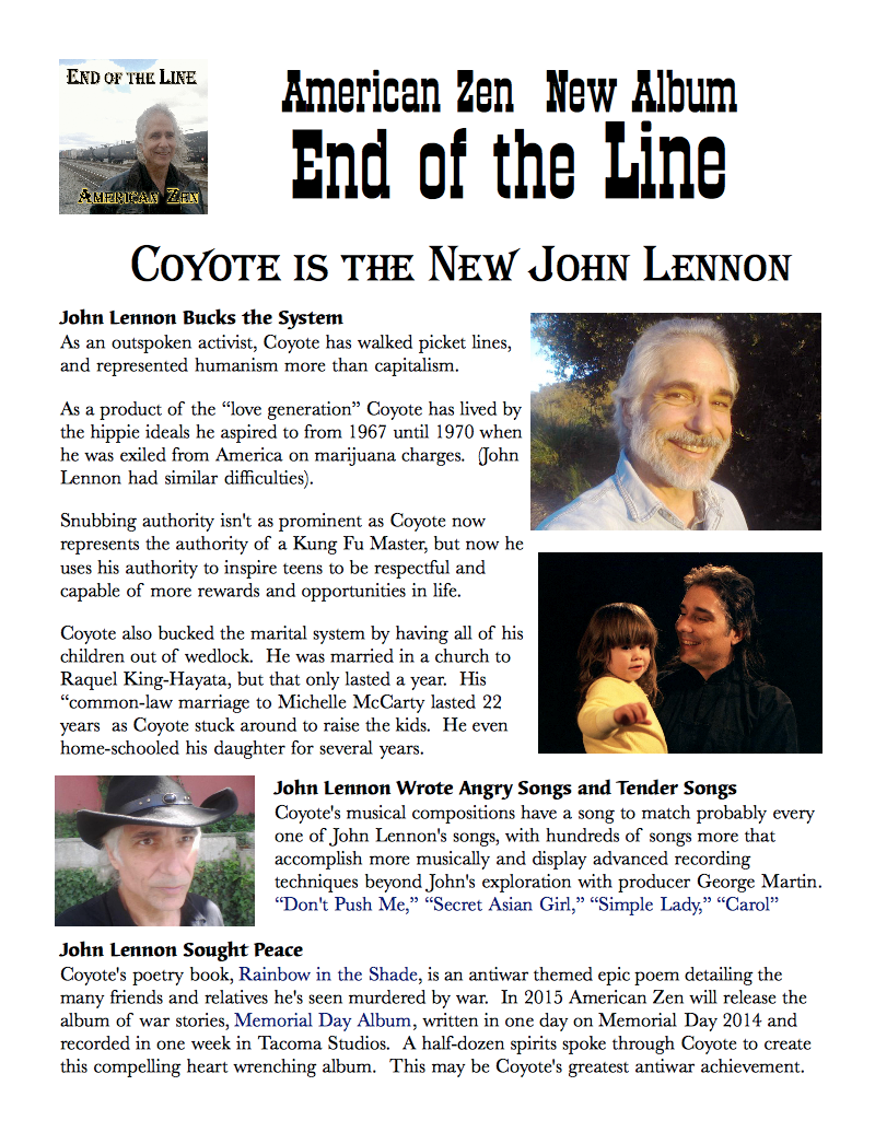ALBUM EPK - End of the Line by American Zen song sample DON'T PUSH ME song sample SECRET ASIAN GIRL song sample SIMPLE LADY song sample CAROL Rainbow in the Shade EPIC POEM book by The Hippy Coyote MEMORIAL DAY ALBUM by American Zen